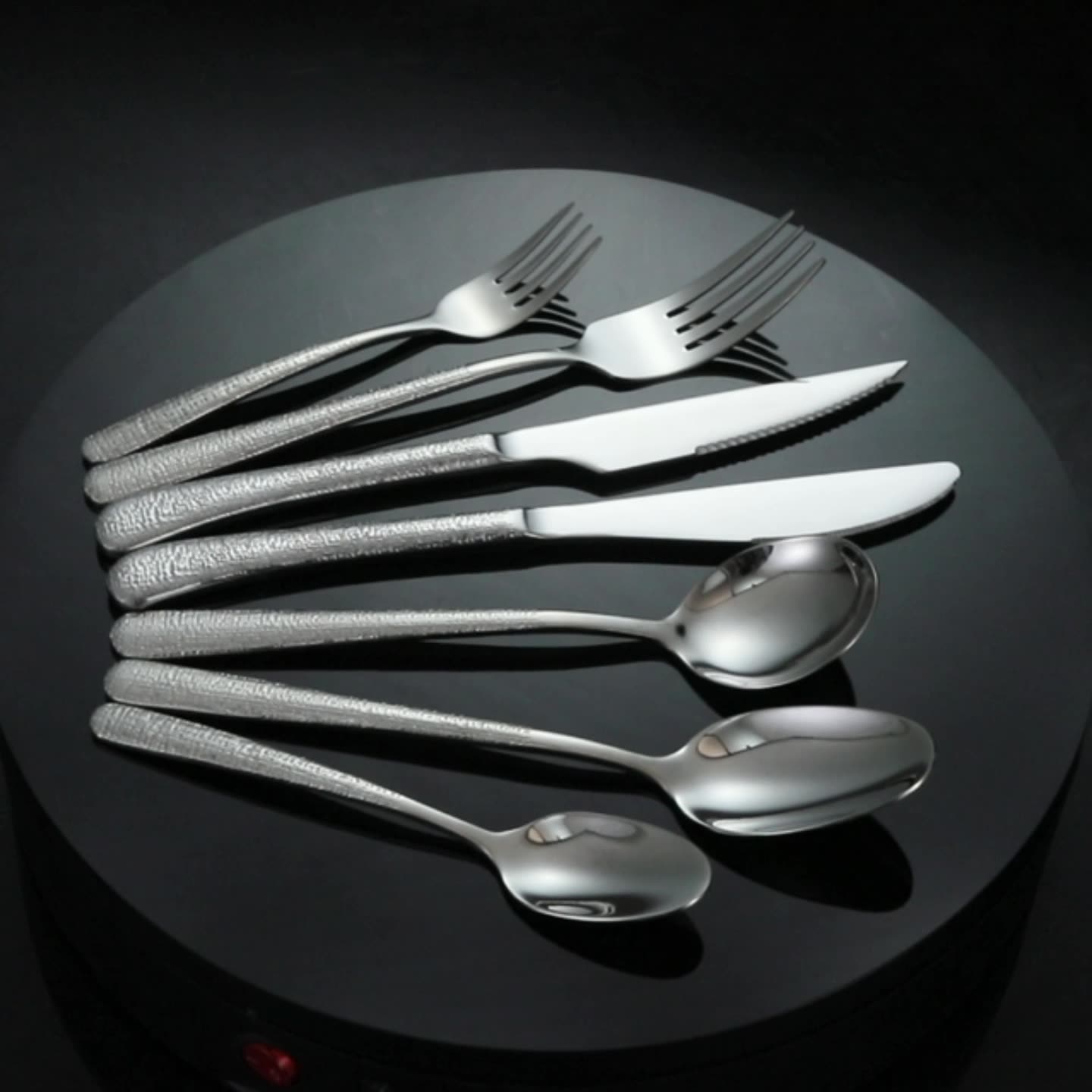 This 304 stainless steel cutlery set features an elegant star diamond crack design, perfect for hotels and fine dining. Includes steak knives, forks, dessert spoons, and tea spoons for a luxurious experience.