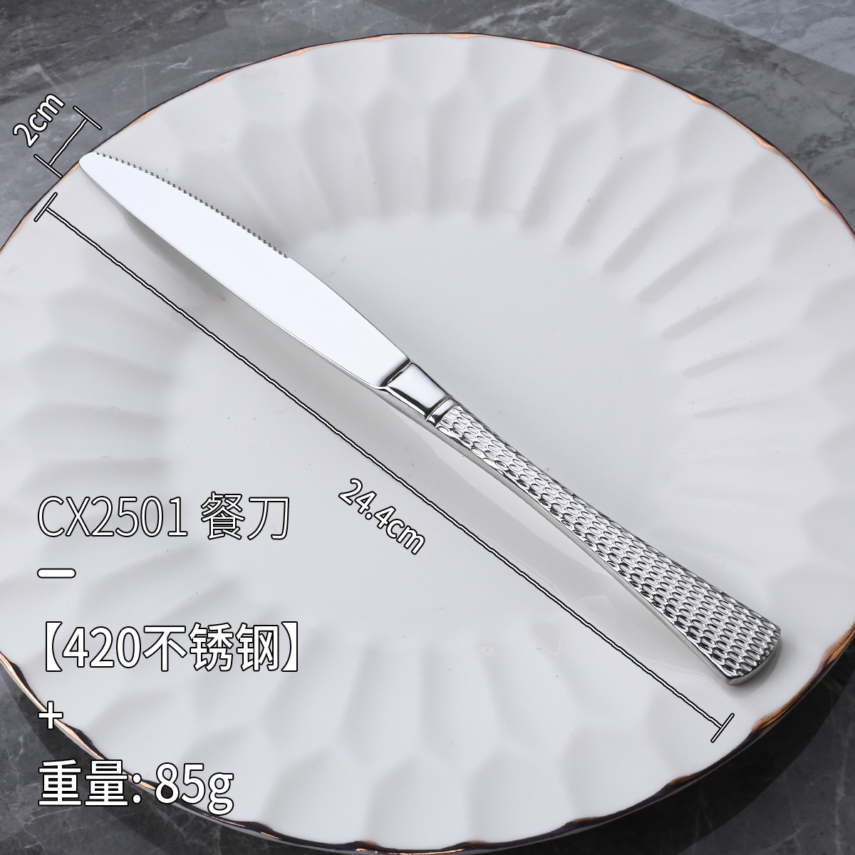 This 304 stainless steel luxury European cutlery set is designed with a fish tail pattern. Includes steak knives, forks, dessert spoons, and tea spoons—perfect for fine dining in hotels and homes.