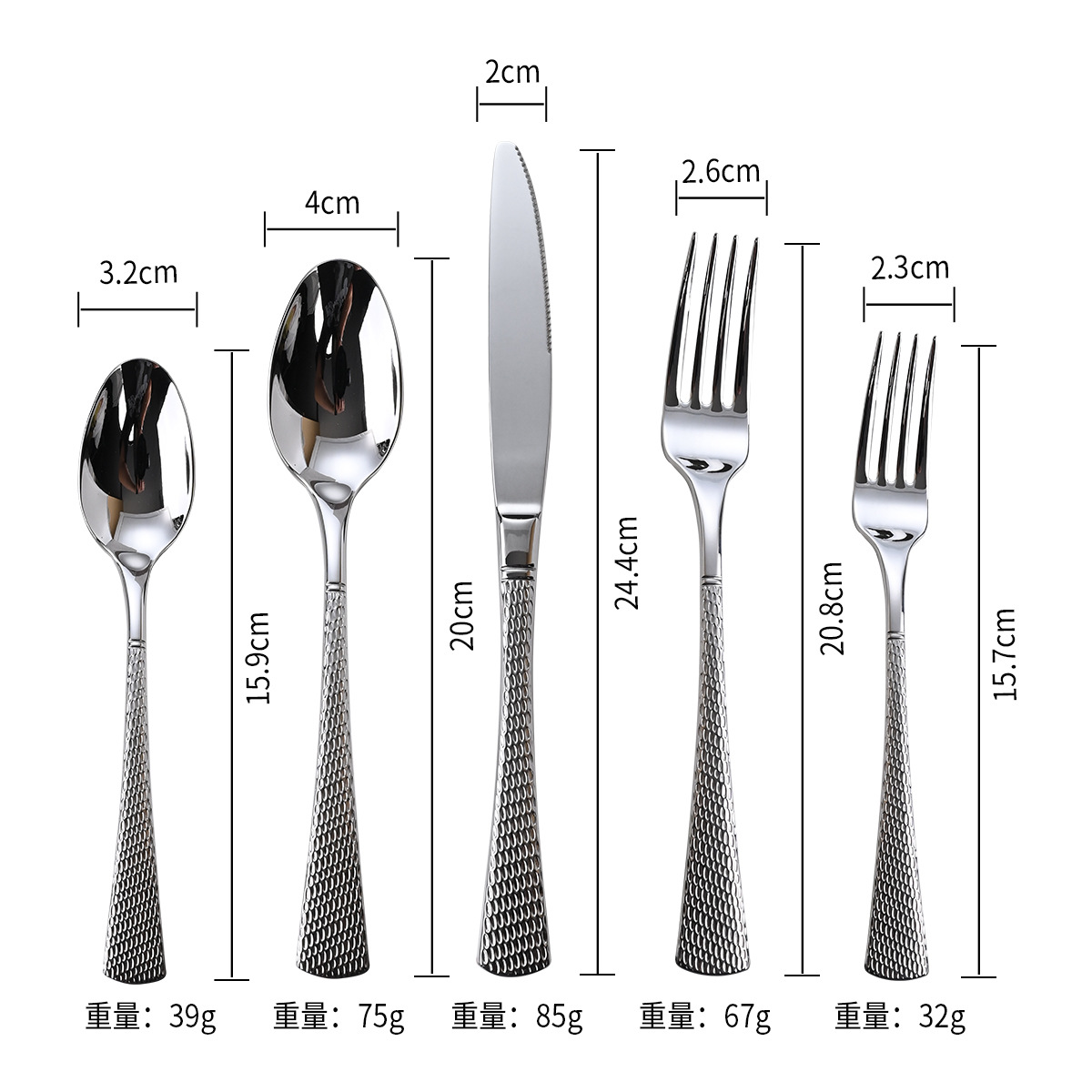 This 304 stainless steel luxury European cutlery set is designed with a fish tail pattern. Includes steak knives, forks, dessert spoons, and tea spoons—perfect for fine dining in hotels and homes.